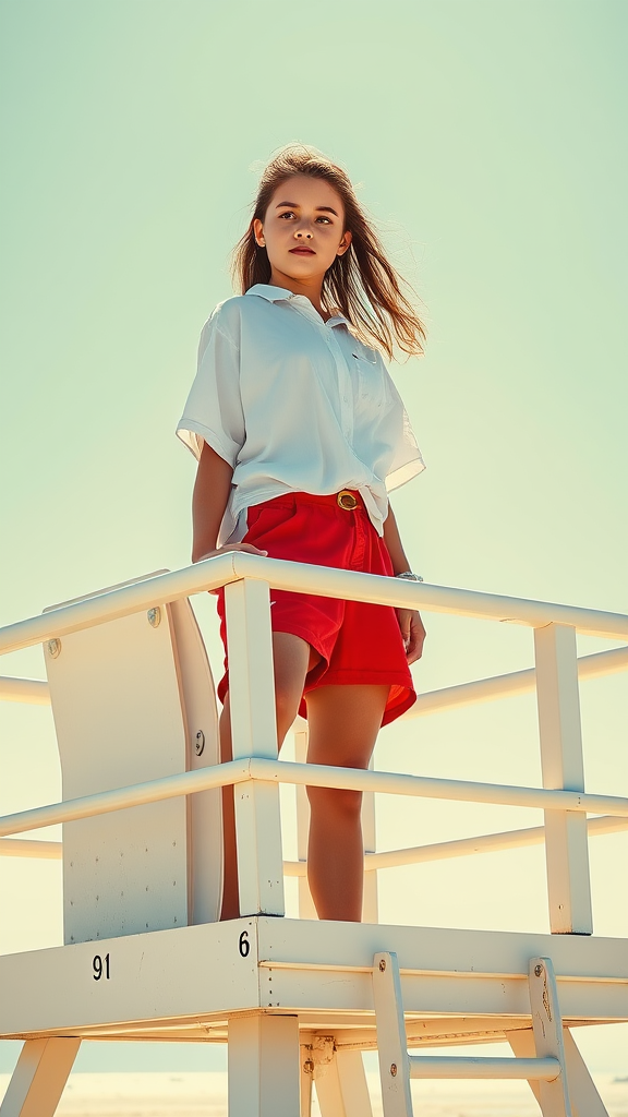 A young female lifeguard is perched atop a gleaming white lifeguard tower, soaking in the sun's warm rays. She's dressed in a simple white shirt paired with vibrant red shorts. The scene is incredibly bright and sun-drenched as she vigilantly scans the beach below. Her hair and eyes are of natural hues, adding to the lifelike quality of the scene. The image is captured in stunning 8K resolution, with professional color grading that enhances the vibrant yet natural look. Depth of field is used to emphasize her focused gaze on the sunlit beach. The overall composition highlights a serene yet watchful atmosphere with a touch of artistic flair.