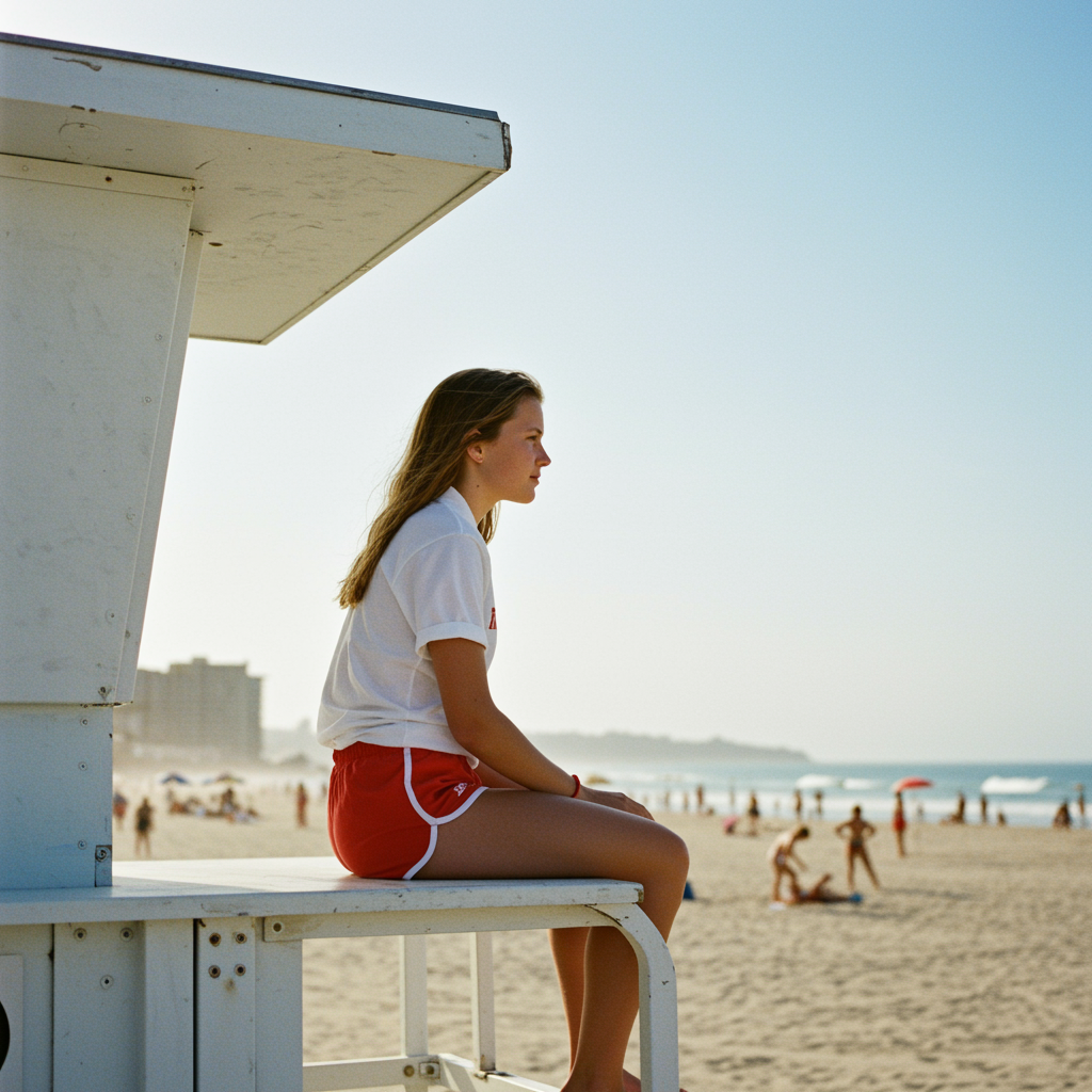 A young female lifeguard sits in the sun atop a white lifeguard tower, wearing a simple white shirt and red shorts. The scene is vividly bright and sunny, with her natural hair color catching the light and eyes attentively watching over the bustling beach below. The atmosphere is captured in stunning 8k resolution, with professional color grading that enhances the vibrant hues of the surroundings. The image features a skillful depth of field, bringing focus to the girl while gently blurring the background to create a sense of serenity amidst the lively beach setting.