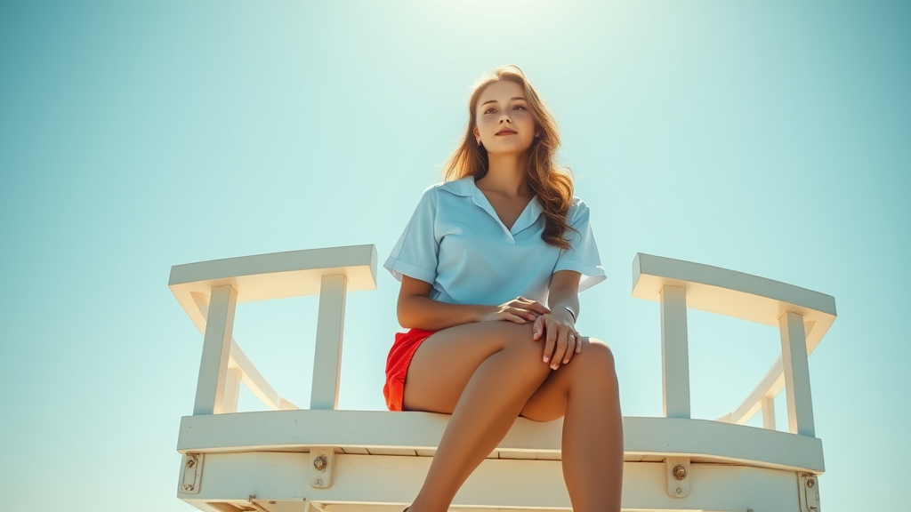 A young female lifeguard sits under the bright sun on a pristine white lifeguard tower. She's wearing a simple white shirt paired with vibrant red shorts. The scene captures a professional, high-definition quality, showcasing expert color grading and an intricate depth of field. The mood is bright and summery, as the warmth of the day envelopes her, highlighting her vigilant but relaxed demeanor as she keeps a watchful eye on the beach below.