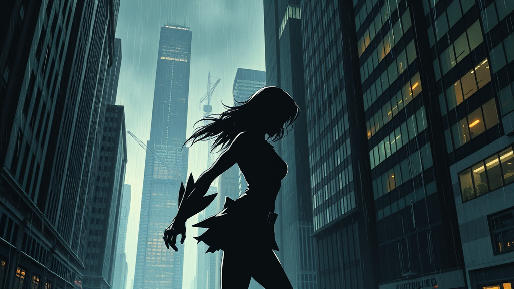 A young female superhero, akin to a will-o'-the-wisp, navigates a gritty, noir-inspired cityscape reminiscent of Frank Miller's style. The atmospheric lighting casts dramatic shadows as she strikes an action pose, her silhouette highlighted against the backdrop of towering, rain-slick buildings. Her presence is both ethereal and powerful, capturing the balance between mystique and strength in a dark, urban environment.