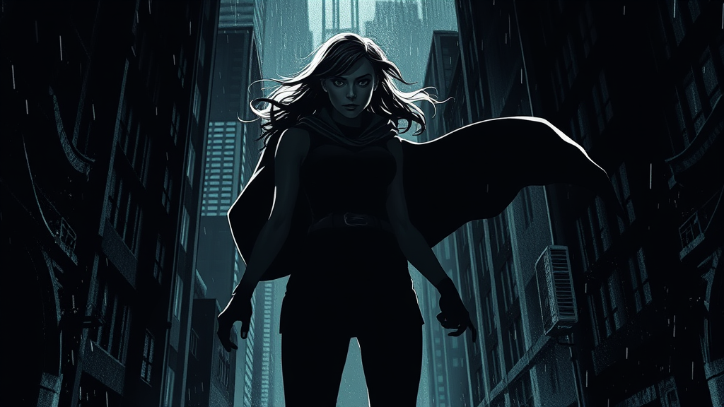 A young female superhero with a will-o'-the-wisp aura stands poised in an action pose, her silhouette stark against the shadows of a dark, rain-soaked city. The atmospheric lighting casts dramatic, angular shadows reminiscent of Frank Miller's graphic style, highlighting the gritty, noir intensity of her surroundings. Her determined gaze and flowing cape add an air of mystery and strength as she navigates the urban labyrinth with agility and purpose.