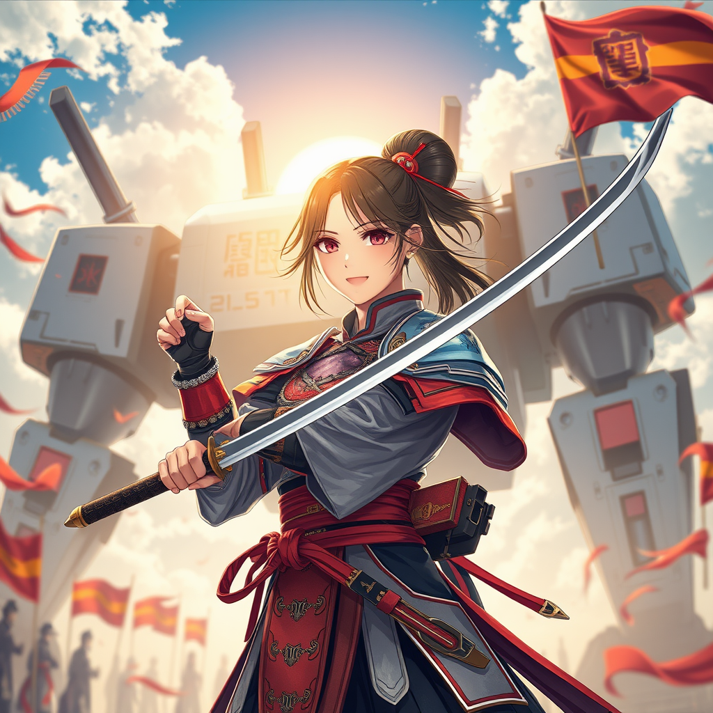 A young female warrior dressed in futuristic, detailed samurai attire stands poised, gripping a sleek samurai saber with confidence. The scene unfolds like a cinematic movie poster, with vibrant, anime-inspired colors bringing it to life. Behind her, bows and fluttering flags add dynamic movement, while an ancient Mech looms in the background, surrounded by sunny skies and natural lighting. The high-definition, CMYK composition is rich in detail, embodying the spirit of manga graphics. This striking 8K poster captures a sense of happiness and resilience, with creative flourishes enhancing its captivating appeal.