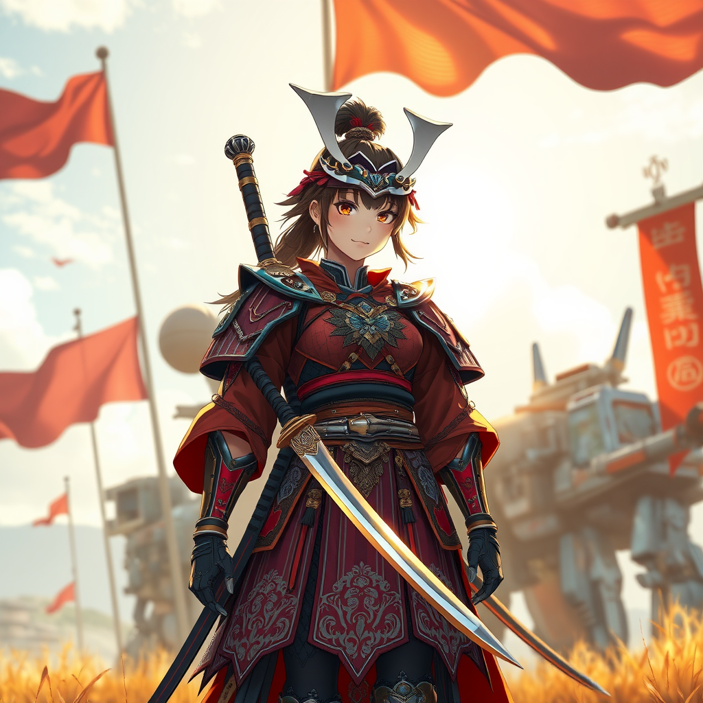 A young female warrior in an elaborate, futuristic samurai outfit stands confidently, clutching a gleaming samurai saber. Behind her, banners ripple in the breeze next to an array of ancient mech structures. The setting is bathed in warm sunlight, evoking a harmonious blend of past and future. The scene is rendered in vibrant anime and manga-style graphics, featuring vivid colors and intricate details reminiscent of offset printing. The atmosphere is bright and cheery, with natural lighting highlighting the high-definition quality. The overall composition resembles a cinematic movie poster, designed in an 8K resolution with CMYK colors, capturing the essence of adventure and tradition in a harmonious blend.