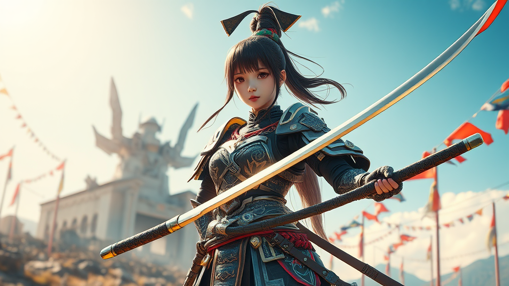 A young female warrior in futuristic, intricately designed samurai armor stands confidently, wielding a sleek saber. The scene is styled like a cinematic movie poster, with vibrant anime and manga-inspired graphics. In the backdrop, ancient mech ruins loom large, and colorful flags flutter gracefully in the sun-drenched sky. The atmosphere exudes a happy and adventurous spirit, emphasized by natural lighting and an array of bright colors. The poster is rendered in high detail with offset printing, suitable for an 8K HD display, encapsulating an epic blend of tradition and futurism.