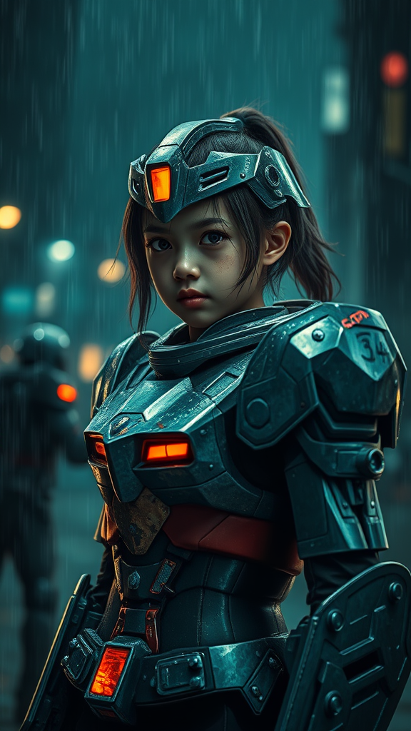 A young girl adorned in Gundam-inspired armor stands amidst the chaos of a dark, rainy night, her battle-damaged suit glistening under the muted glow of distant city lights. Engaged in an epic confrontation, her face bears the marks of the struggle, etched with pain and determination. The scene unfolds like a cinematic masterpiece, capturing every intricate detail with stunning clarity and vivid colors. The environment is surreal and divine, reflecting a celestial atmosphere reminiscent of a legendary manga or anime. The polished armor shimmers with lumen reflections, creating a hyperrealistic portrayal that draws you in. Despite the low resolution and occasional blurring, the overall composition is mesmerizing, exuding a sense of raw intensity and beauty.