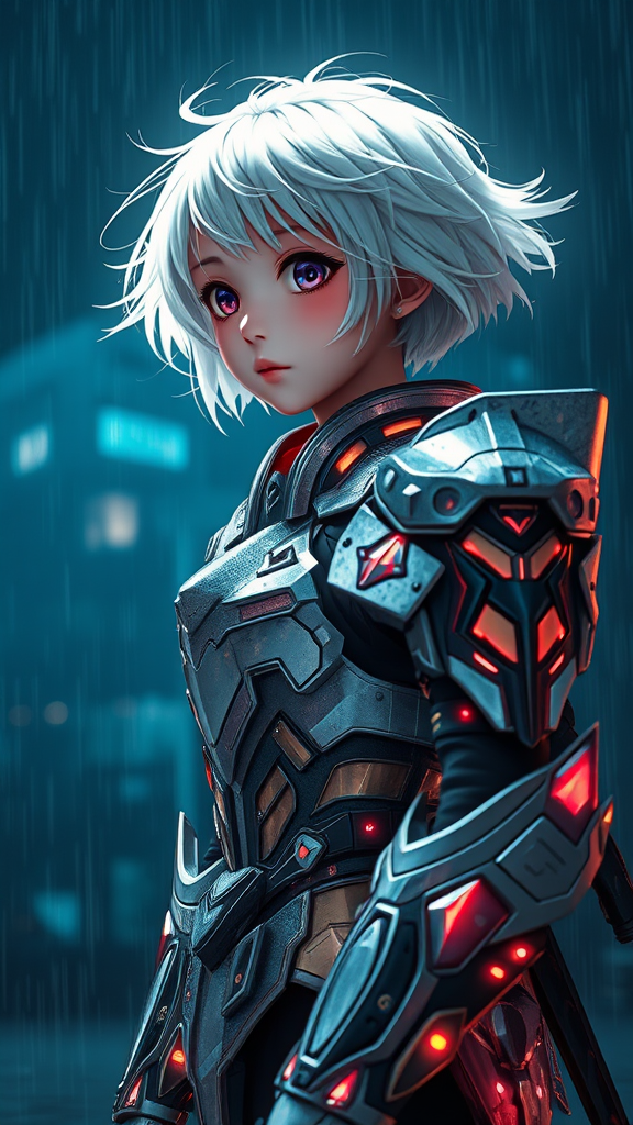 A young girl adorned in intricate Gundam-inspired armor, her short white hair tousled by the wind, stands alone on a dim, rain-soaked night. The scene is set with a vivid and cinematic flair, boasting extreme detail and artistry reminiscent of high-caliber photography. The environment gleams with surreal and divine aesthetics, merging celestial elements with sleek, shiny surfaces to create a mesmerizing, advanced anime CGI style. The atmosphere feels both otherworldly and serene, like a masterpiece brought to life in 3D. Despite the low-resolution effect that gives it a nostalgic touch, the ethereal beauty remains untarnished by the imperfections often seen in lesser works. The composition maintains a focus on the girl's presence against the backdrop, keeping distractions such as framing errors, poor anatomy, or deformities at bay, capturing the essence of a celestial warrior in an awe-inspiring moment.