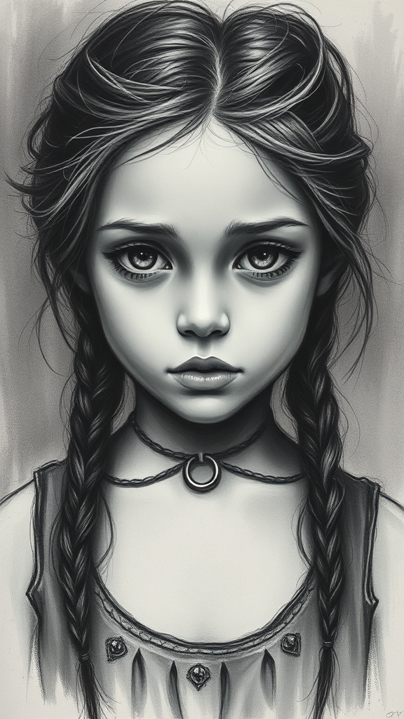 A young girl captured in a charcoal sketch, her features soft yet striking, a whirlwind of emotion reflected in her eyes and posture, conveying a deeply expressive mood that whispers stories of dreams and mysteries untold.