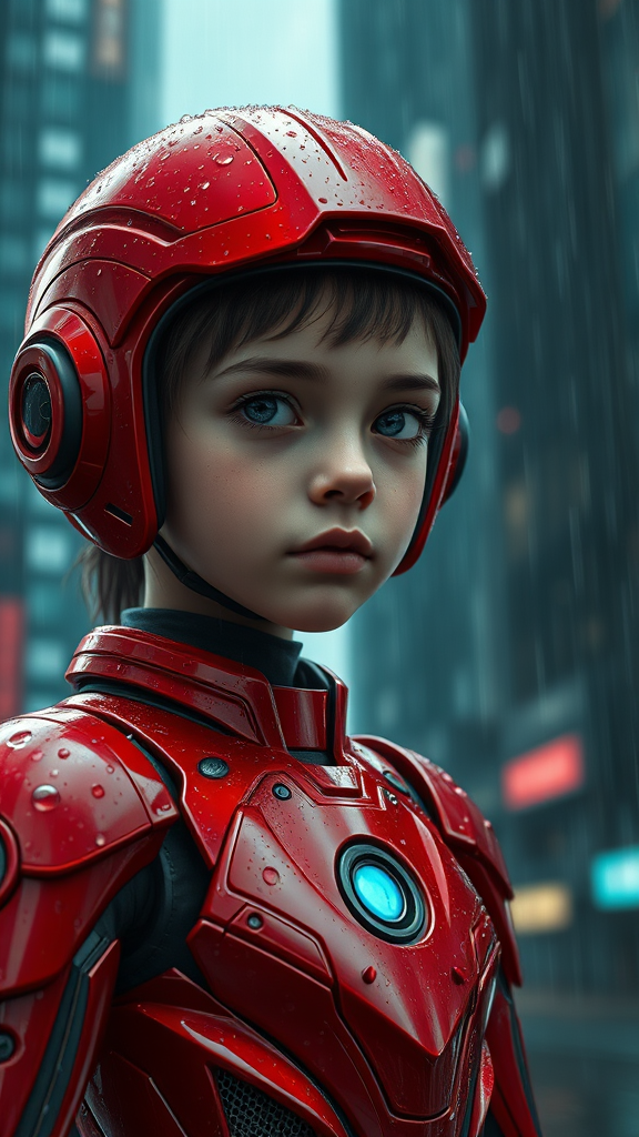 A young girl clad in a vivid crimson robotic suit stands resiliently under the pouring rain, each droplet glistening against the highly detailed and hyper-realistic style that melds elements of Skottie Young's whimsical flair with the enigmatic tones evocative of Daria Endresen. Her expression, captured in an intimate close-up, reflects a blend of determination and curiosity, as striking metallic hues of her suit contrast with the gentle patter of rain. The atmosphere is tinged with the digital mystique of webcore, while subtle nods to Eve Ventrue's dramatic storytelling imbue the scene with depth. The elongated 9:16 aspect ratio accentuates the towering cityscape behind her, blurred yet brightened with neon lights, as the stylization of 750 harmonizes this futuristic narrative in a lush 32k UHD clarity.