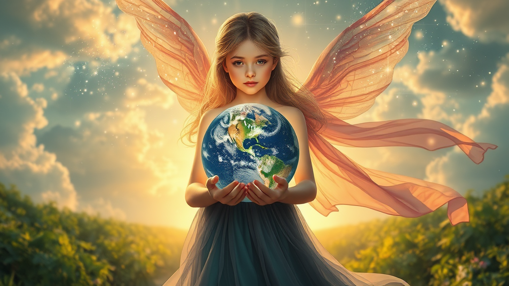 A young girl clad in an ethereal flowing dress stands gracefully, cradling a radiant globe with delicate hands; she embodies an earth goddess aura, exuding an enchanting presence. The scene unfolds in a mesmerizing blend of realism and fantasy, capturing the essence of mystical wonder. Her features draw inspiration from vibrant anime fantasy, with influences of Artgerm and Atey Ghailan's work, while the scene echoes the dynamic style of Guweiz. The landscape around her seems to shimmer with an otherworldly beauty, casting her as a protector of the earth, surrounded by lush greenery and celestial light, creating an exquisite digital masterpiece, a stunning tapestry of fantasy art that captivates the imagination.