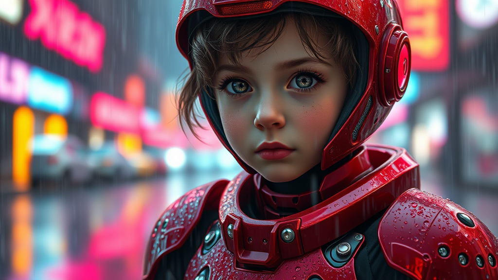 A young girl clad in an intricately designed crimson robotic suit stands amidst a downpour, each raindrop meticulously rendered as it cascades over her metallic armor. Her eyes, wide with curiosity and intensity, reflect the neon-lit surroundings in vibrant detail, capturing a sense of wonder and resilience. The hyperrealistic style merges with the whimsical elements reminiscent of Skottie Young's art, blending seamlessly with the surreal undertones akin to those found in Daria Endresen's works. The close-up perspective reveals the suit's intricate circuitry and glistening surface, the vivid imagery popping in 32k ultra-high definition. A touch of webcore aesthetic weaves through the scene, interlacing digital motifs with the organic feel of the rain-soaked environment. The essence of Eve Ventrue's darkly enchanted style infuses the scene with an ethereal glow, transforming the rainy backdrop into a tapestry of saturated colors and reflections. This artistic vision, framed within a 9:16 aspect ratio, invites viewers into a rich, immersive world where technology and nature coexist in harmony, styled with just the right amount of flair at a stylize value of 750.