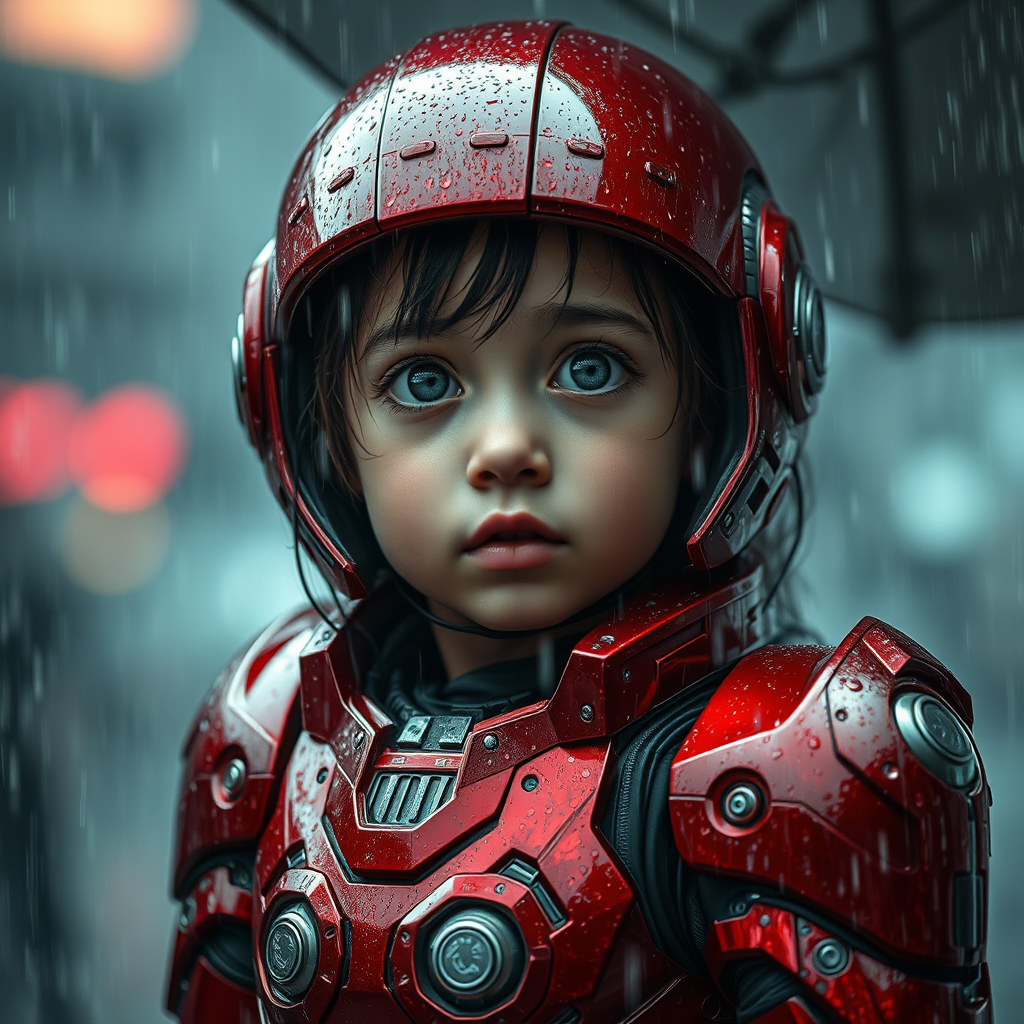 A young girl clad in an intricately designed red robotic suit stands amidst a downpour, the rain cascading over her metallic armor in mesmerizing detail. Her wide, curious eyes gaze into the storm, revealing a blend of innocence and resilience. The scene, rendered in hyperrealism, showcases fine details reminiscent of Skottie Young's playful style and Daria Endresen's ethereal atmosphere, with a high-definition quality akin to 32k UHD. The close-up captures the vibrant hues and textural intricacies of the webcore aesthetic, with a touch of Eve Ventrue's dramatic flair. The aspect ratio is a striking 9:16, emphasizing the girl's youthful determination against the backdrop of a digitally enhanced, futuristic rain-soaked world. The composition is artistically stylized, weaving together a tapestry of creativity and emotion, creating a captivating visual narrative.