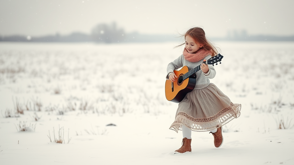 A young girl dances across a snowy field, her laughter mingling with the crisp air as she twirls beneath the delicate snowfall; her voice carries sweet melodies of song as she strums the strings of her bandura, the harmonious notes painting the winter landscape with musical warmth.
