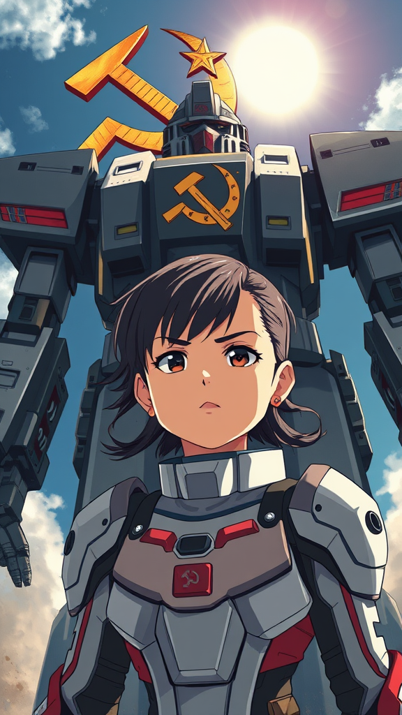 A young girl dons a futuristic sci-fi suit, embodying the bold spirit of Soviet-era posters. Her determined gaze is set against a striking backdrop featuring the iconic hammer and sickle. Towering behind her is a colossal mech, its metallic form gleaming under a bright sunny sky. The scene is rendered in anime and manga styles, with dark, rich colors adding depth to the artwork. Offset printing techniques highlight the high detail of the composition, while natural lighting lends a sense of realism. This imaginative poster boasts an 8K HD resolution, utilizing the vibrant CMYK palette to capture a sense of joy and optimism.