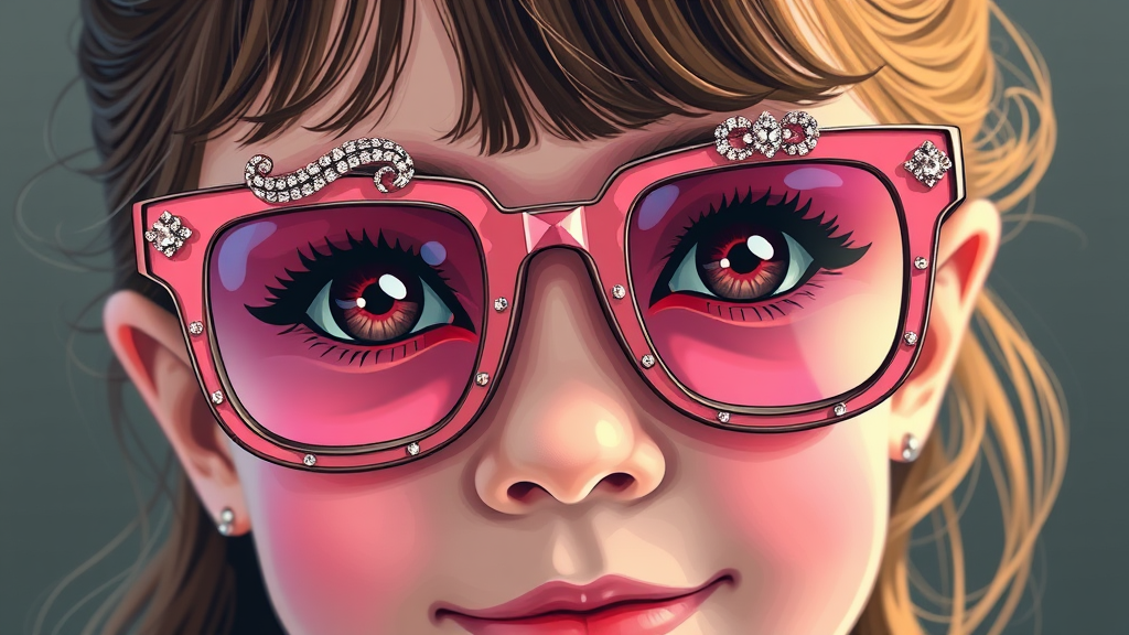 A young girl dons rose-tinted glasses adorned with eye motifs, crafted in the style of metallic rectangles encrusted with crystals, evoking the whimsical essence of Melissa Launay's art. The design incorporates elements of pigeoncore, rendered with a pixelated touch, embodying iconic American flair with distinctly crisp outlines.