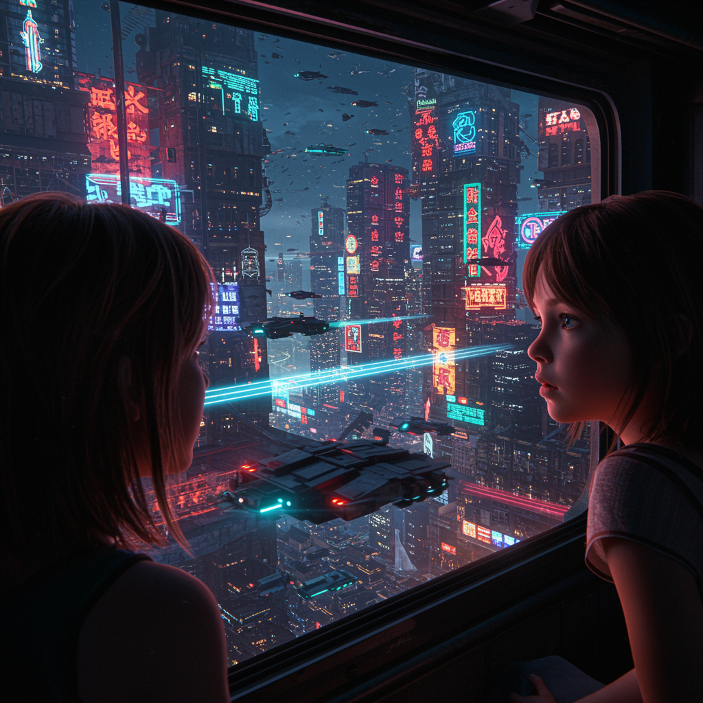 A young girl gazes intently through the panoramic window of a spacecraft gliding silently through a sprawling, futuristic neon-drenched dystopian city, the urban landscape a maze of towering skyscrapers aglow with vibrant, pulsating lights. The scene is bathed in dramatic lighting, casting dynamic shadows and highlights that enhance the hyper-realistic, lifelike textures. The high detail RAW color image captures ultra high resolution 8K visuals, with a focus on physics-based rendering that ensures realism is at the forefront, providing rich, contrasting colors and hyperrealism. Outside, a sea of hovering vehicles zip past, their trails leaving luminescent streaks of color against the inky night sky. The girl's reflection in the glass adds depth, her eyes wide with a mix of wonder and introspection, creating an intimate connection amidst the vast, almost overwhelming cityscape. The city hums with life, every pixel revealing intricate details, from the crumbling facades of older buildings to the sleek, gleaming exteriors of the new. This vibrant, living mural encapsulates the essence of a cyberpunk future, where technology and humanity intersect.