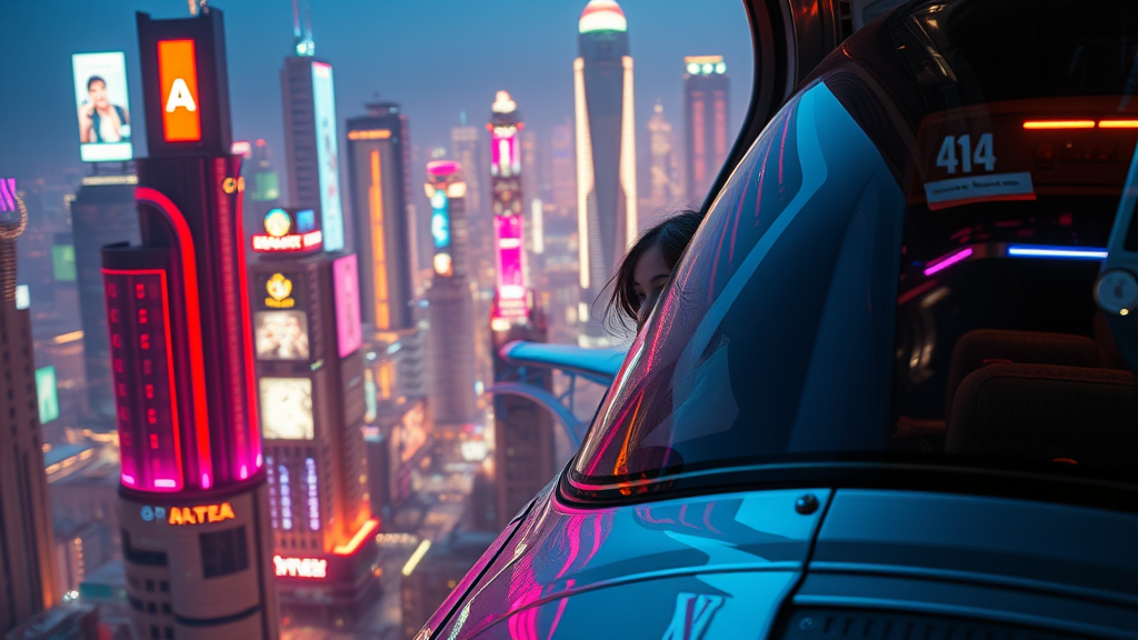 A young girl gazes through the window of a sleek spaceship cruising amidst a sprawling futuristic, neon-lit cyberpunk metropolis. The cityscape glows vividly with towering skyscrapers adorned with animated billboards and holograms, casting multicolored reflections across the sleek hull of the spacecraft. Dramatic lighting highlights the intricate details of her surroundings, while her eyes – wide with wonder – capture the blend of technological advancement and dystopian reality. The scene is captured in ultra high resolution, featuring hyper-realistic textures and lifelike detail. Rich, vibrant colors enhance the hyperrealism, showcasing a breathtaking contrast between the dark atmosphere and the striking neon hues illuminating the city. The image evokes a sense of awe and exploration, rendered with physics-based techniques that bring every element into sharp focus, simulating an immersive cinematic experience.