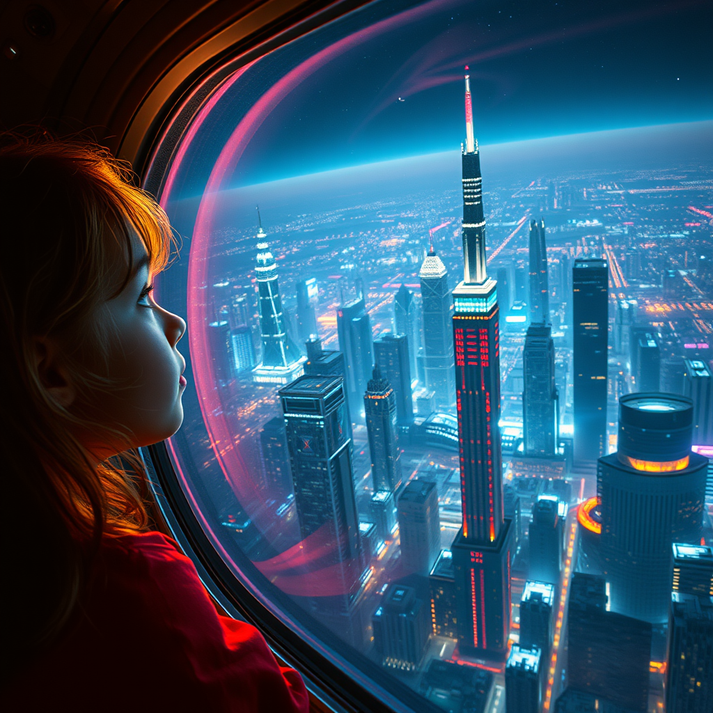 A young girl gazes with wonder through the expansive window of a cutting-edge spacecraft, soaring above a sprawling, neon-illuminated cyberpunk metropolis. The city below is a visual spectacle, its towering skyscrapers adorned with pulsating holograms and flickering lights, casting a vibrant glow into the cosmos. Dramatic lighting casts intricate shadows and highlights the girl's face, capturing her awe at the dystopian landscape. The scene is meticulously detailed, rendered in ultra-high resolution, showcasing hyper-realistic, lifelike textures and vivid colors with high contrast. The realism is achieved through sophisticated physics-based rendering, offering an immersive and cinematic experience reminiscent of cinestill 800 film. The image evokes a sense of adventure and curiosity, free from distractions such as jpeg artifacts or artificial cropping, presenting a pristine glimpse into a futuristic world where technological marvels meet humanity's enduring quest for exploration.