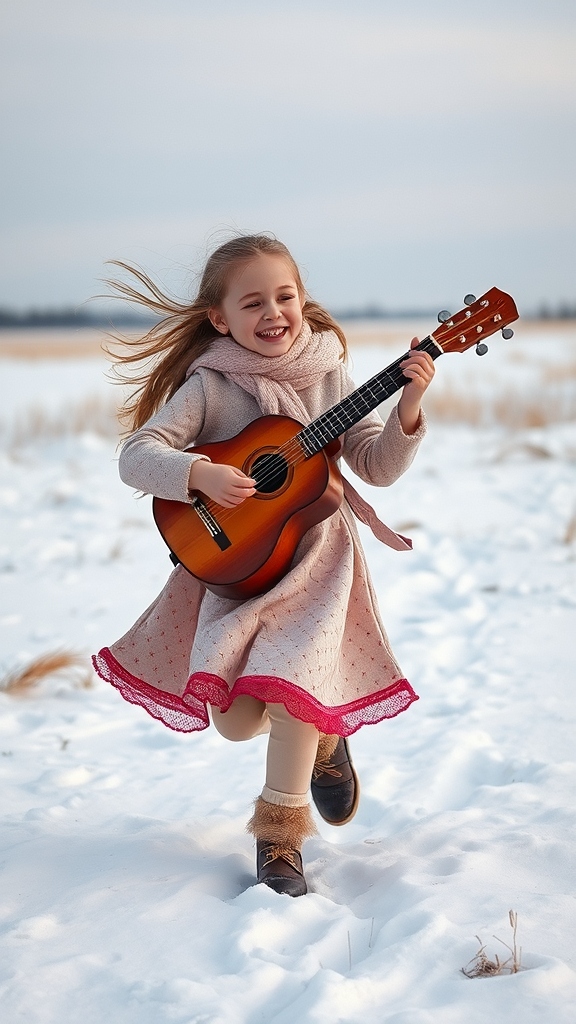 A young girl gleefully dances across a snow-blanketed field, her laughter mingling with the crisp winter air as she sings a melodious tune, her fingers expertly plucking the strings of a bandura, weaving harmonious notes that echo through the serene, snow-covered landscape.