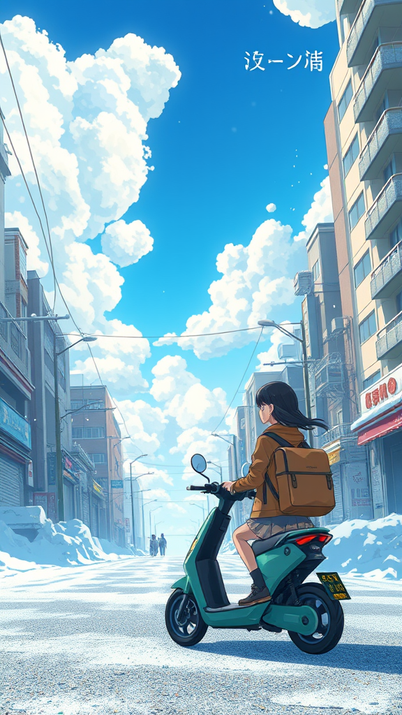 A young girl glides gracefully on an electric scooter through a captivating anime scene reminiscent of Hayao Miyazaki's work. The streets of a snowy Tokyo are transformed into an enchanting landscape, with enormous, whimsical clouds drifting across a brilliant blue sky. The city's snowscapes glisten under the warm glow of sunlight, evoking the magic of Miyazaki's imagination. Japanese artistic influences weave through the scene, creating a harmonious blend of nature and urban wonder in a 16:9 cinematic view.