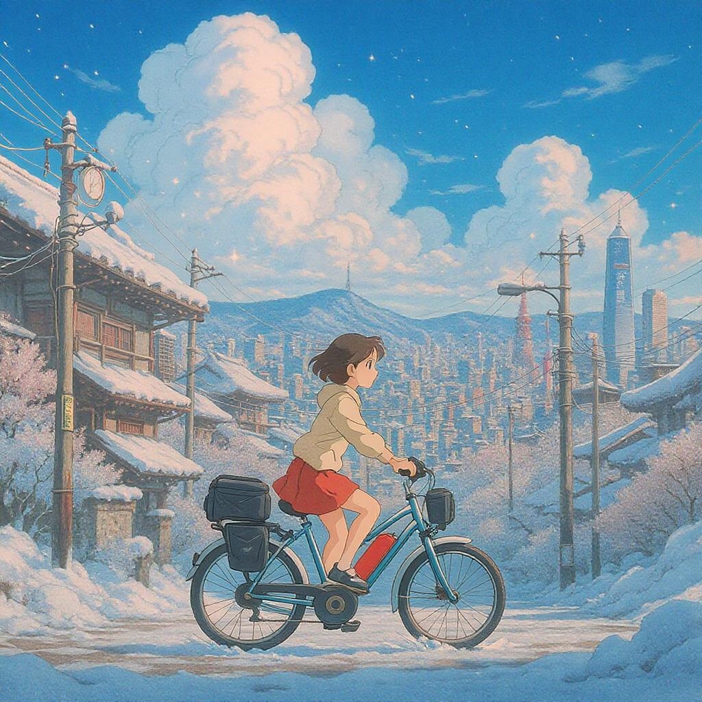 A young girl gliding gracefully on an electric bike through an enchanting anime scene inspired by Hayao Miyazaki: the streets of snowy Tokyo stretch before her, towering fluffy clouds reminiscent of Miyazaki's works drift lazily against a cerulean sky, the city's winter wonderland sparkling under the warm embrace of sunlight, evoking the delicate beauty of Japanese art, with sprawling, intricate landscapes that highlight the harmonious blend of nature and urban life.