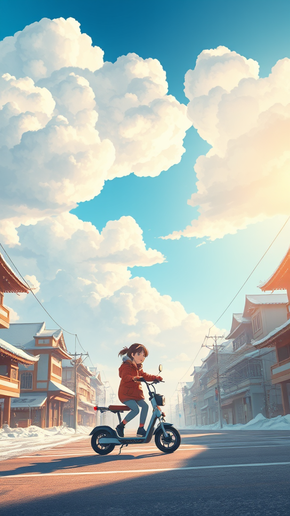 A young girl gliding joyfully on an electric scooter through the enchanting snowscape of a serene Kyoto city, captured in an anime scene reminiscent of Hayao Miyazaki's storytelling. Above, massive ethereal clouds drift gracefully across a brilliant azure sky, casting whimsical shadows on the bright, snow-draped streets below. The scene is infused with Miyazaki's signature landscape artistry, blending intricate Japanese architecture with a touch of magic. The golden sunlight bathes the cityscape, creating a warm, nostalgic glow that invites wonder and adventure.