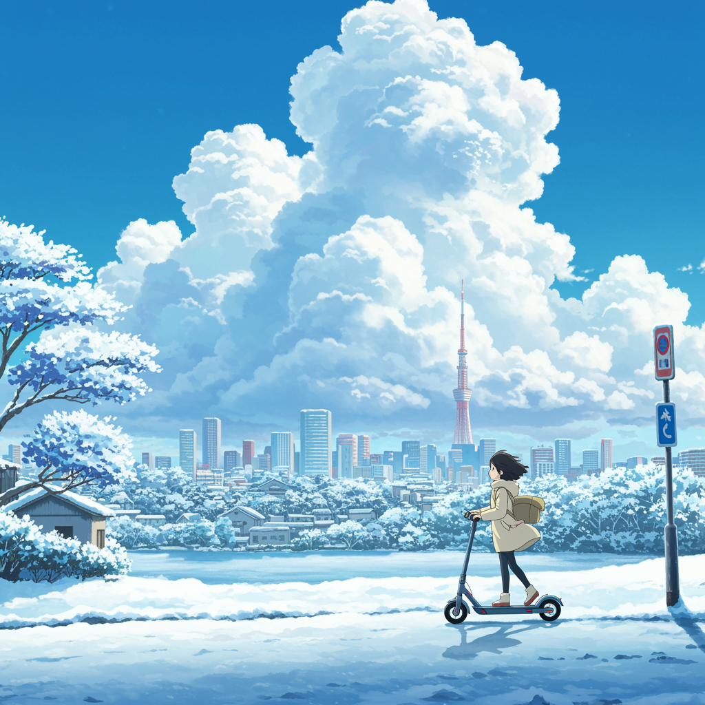 A young girl gracefully gliding through a picturesque anime landscape on her electric scooter, inspired by the enchanting style of Hayao Miyazaki: a serene, snowy Tokyo teeming with charm, adorned by massive, ethereal clouds drifting across a vibrant blue sky, filling the atmosphere with wonder. The city's snow-laden scenery glistens under the radiant sunlight, showcasing Miyazaki's iconic landscape artistry, blending seamlessly with traditional Japanese aesthetics in a captivating 16:9 composition.