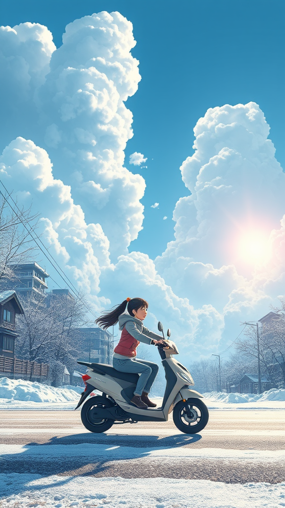 A young girl gracefully navigating a whimsical electric scooter through an enchanting anime landscape inspired by Hayao Miyazaki; a snow-dusted Tokyo cityscape unfolds with colossal, fluffy clouds sailing through a crystal-clear blue sky, the sun casting a magical glow over the serene, snow-covered metropolis; infused with Miyazaki's enchanting landscape artistry, the scene is reminiscent of classic Japanese art with a 16:9 cinematic composition.