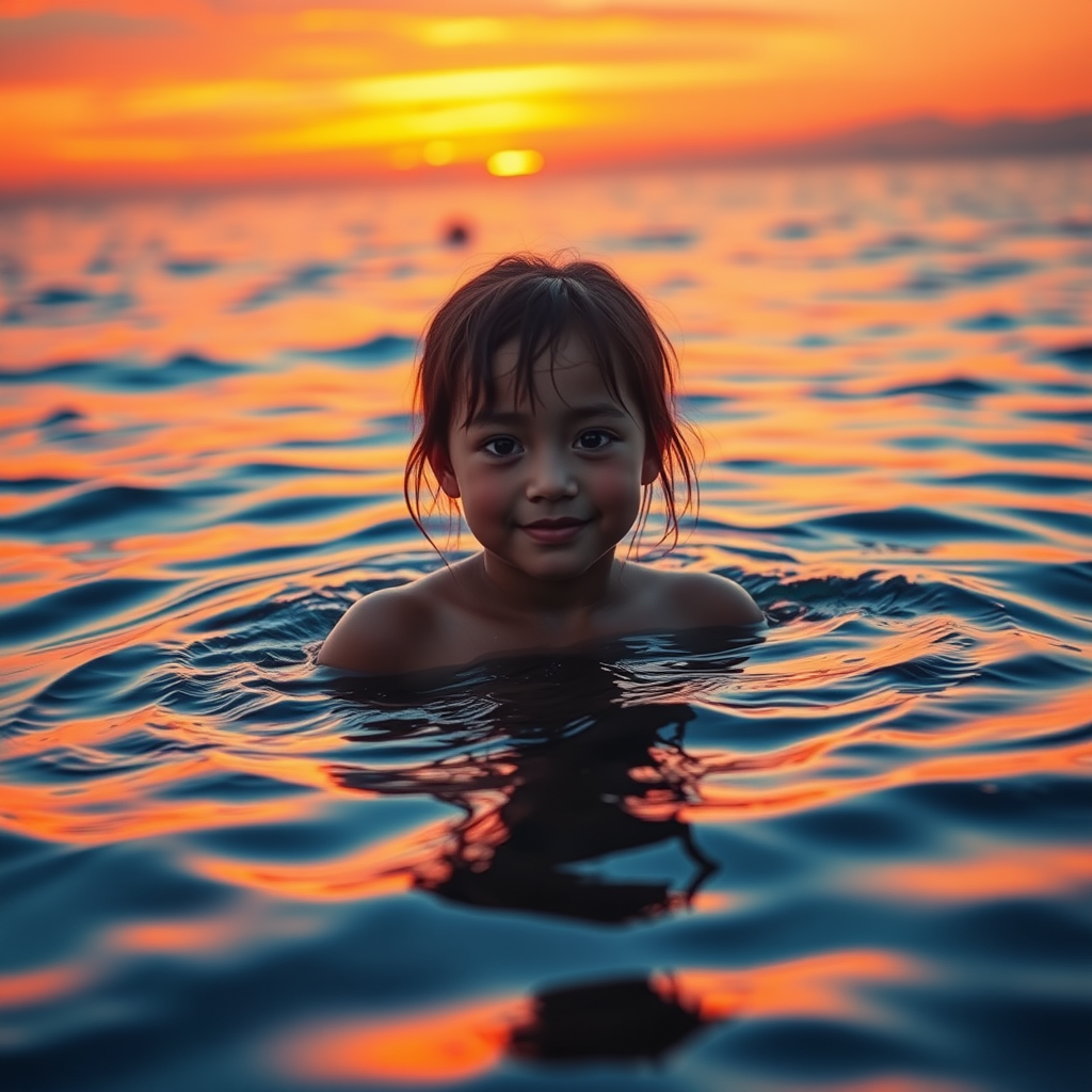 A young girl immersed in the ocean at sunset, captured in a hyper-realistic portrait style with gongbi influences, where hues of crimson and amber dominate the scene. Intricate, blink-and-you-miss-it details enhance the snapshot aesthetic, blending with glowwave and poolcore elements. Rippling water reflects a kaleidoscope of colors under the fading light, her silhouette softly illuminated in a surreal glow. The narrow aspect ratio enhances the depth and expanse of the ocean, inviting a closer look at the serene yet vibrant interaction of light and liquid.
