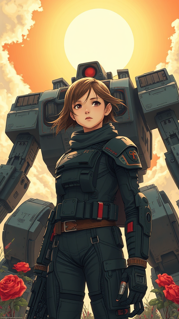 A young girl in a battle-worn futuristic suit stands resolute, inspired by Soviet and USSR poster styles, with a bold fusion of gun and roses motifs behind her. The backdrop features a massive, imposing Mech under a bright, sunny sky, rendered in anime and manga graphics. The color palette is rich with dark hues, and the offset printing technique adds depth. The scene is intricately detailed, showcasing ornate elements in a high-detail illustration reminiscent of octane render. Inspired by Johanna Rupprecht's and William Morris's styles, the artwork is visually striking and trending on artstation, creating a captivating 8k poster.