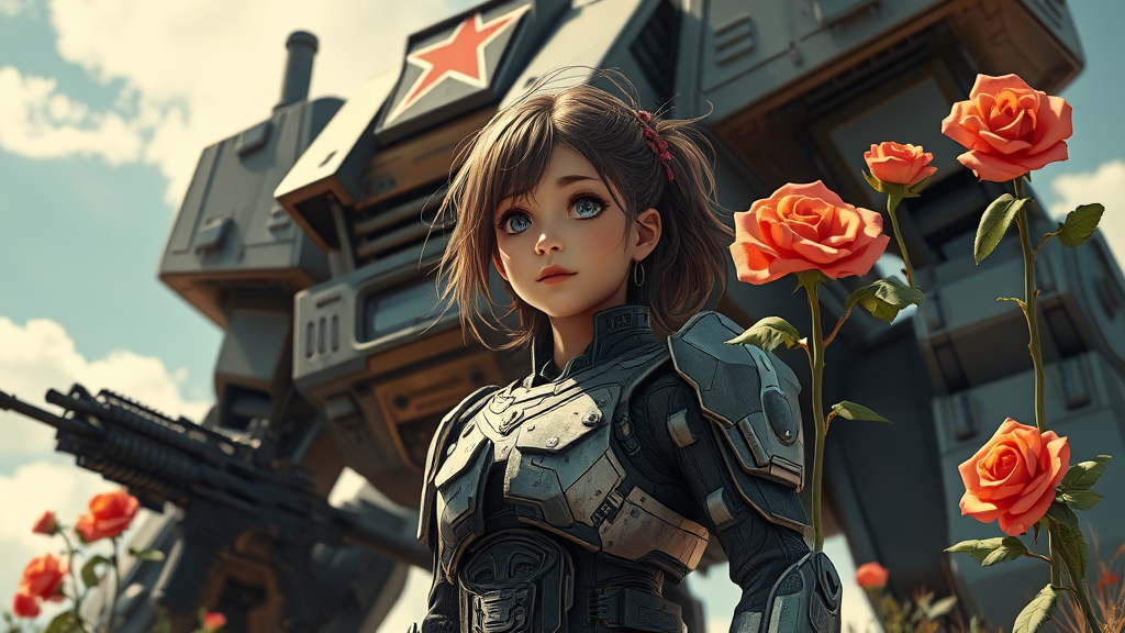 A young girl in a damaged futuristic suit stands boldly, her expression a mix of determination and resilience. The scene is styled like a Soviet-era poster, evoking a sense of strength and revolutionary spirit. In the background, a juxtaposition of guns and roses create a striking contrast, symbolizing both conflict and beauty. Towering behind her is a massive mech, its intricate mechanics rendered in exquisite detail. The weather is sunny, casting sharp shadows and highlighting the crisp anime and manga-inspired graphics. The dark color palette enhances the dramatic tone, with offset printing adding a touch of vintage authenticity. The illustration, detailed in the ornate style of Johanna Rupprecht and William Morris, bursts with rich intricacy. This piece, worthy of trending on ArtStation, is designed as a high-detail 8k poster, capturing the viewer's attention with its octane render and complex artistry.
