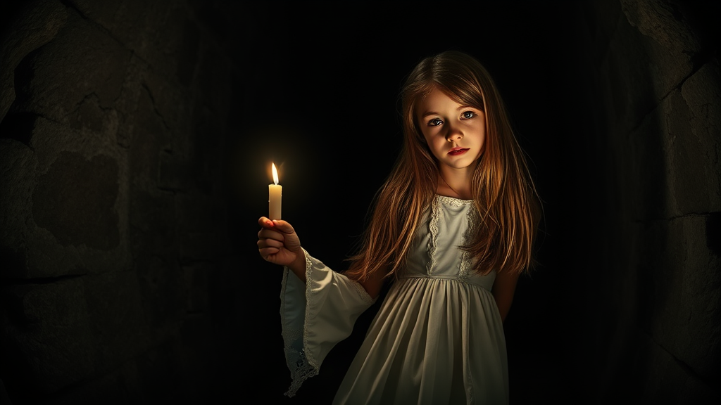 A young girl in a flowing white dress holds a candle in her hand, exploring the shadowy corridors of a dark, foreboding castle. The dim light flickers, casting eerie shadows on the stone walls. Her expression is a mix of curiosity and apprehension as she navigates the oppressive silence of the castle interior. The air is cold and damp, amplifying the unsettling atmosphere. Her long hair cascades down her back, blending into the ghostly ambiance. The flickering candlelight reveals faded tapestries and cobwebbed corners, hinting at the castle's forgotten history. Her delicate features are partially obscured by the shifting shadows, enhancing the mystery of the scene.