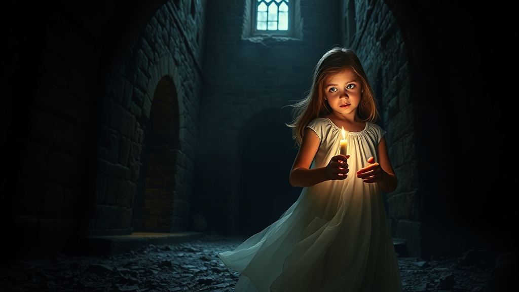 A young girl in a flowing white dress holds a flickering candle as she explores a shadowy, eerie castle. The dim light casts flickering shadows on the ancient stone walls, revealing glimpses of the castle's decayed grandeur. The air is filled with the subtle scent of melted wax and age-old dust. Her eyes, wide with curiosity, scan the dark corridors and mysterious doorways, searching for secrets hidden in the depths of the castle. Her presence seems to bring a haunting beauty to the forgotten halls, contrasting with the chilling atmosphere that surrounds her. The candlelight dances across her face, illuminating her features with a warm, gentle glow as she moves gracefully through the darkness, embodying a sense of intrigue and bravery.