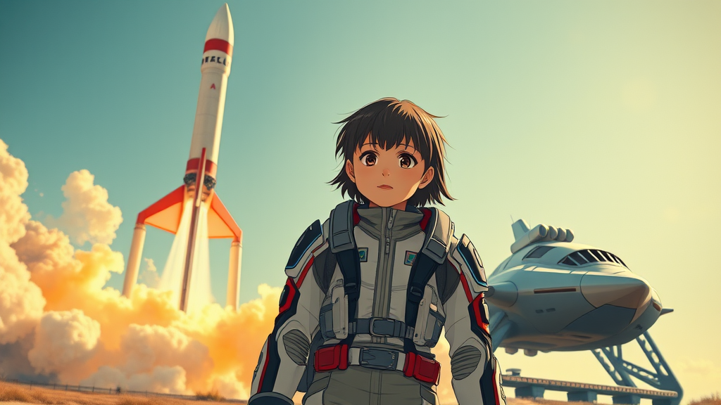 A young girl in a futuristic sci-fi suit stands confidently, embodying the spirit of exploration and adventure in a poster reminiscent of Soviet-era design. A towering rocket ignites in the background, ready to launch into the cosmos, with a sleek spaceship hovering nearby. The scene is set on a bright, sunny day, blending the bold, dynamic lines of anime and manga with deep, rich colors characteristic of offset printing. Every detail is intricately rendered in high definition, creating a visually striking image that captures the imagination. The poster, designed with an 8K resolution and CMYK colors, radiates happiness and optimism through its natural lighting, encapsulating a sense of bold aspiration and youthful vitality. The overall composition is characterized by a vibrant yet dark color palette, enhancing the dramatic impact of this dynamic scene.