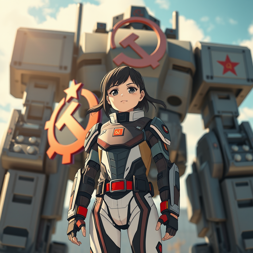 A young girl in a futuristic sci-fi suit stands confidently, styled like a classic Soviet poster, with elements reminiscent of USSR design, featuring a bold hammer and sickle subtly incorporated into the background. Behind her looms a massive mech, capturing the grandeur of technological advancement. The scene is bathed in sunny weather, rendered in anime and manga artistic style, using dark color palettes with intricate details. The image emulates the look of offset printing, offering high-resolution detail in 8K, maintaining a vibrant CMYK spectrum. The atmosphere is one of happiness and optimism, under natural lighting, capturing a sense of youthful determination and hope.