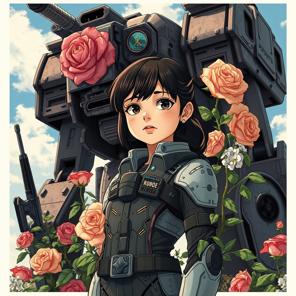 A young girl in a futuristic, slightly damaged suit stands confidently, reminiscent of a Soviet poster style. Behind her, intricate details of a mech loom large, contrasting with the vibrant sunny weather. The scene is rich with dark colors, set in an anime and manga graphics style, reflecting a high level of detail. A mix of roses and a vintage weapon form an intriguing backdrop, echoing themes of both peace and conflict. The image possesses the intricate and ornate qualities found in Johanna Rupprecht and William Morris's styles, making it highly detailed and suitable for offset printing. Captured in a high-resolution 8k format, this illustration is designed to be eye-catching and engaging, trending for its shared aesthetic qualities on platforms like ArtStation, striking a balance of creativity and core inspiration.