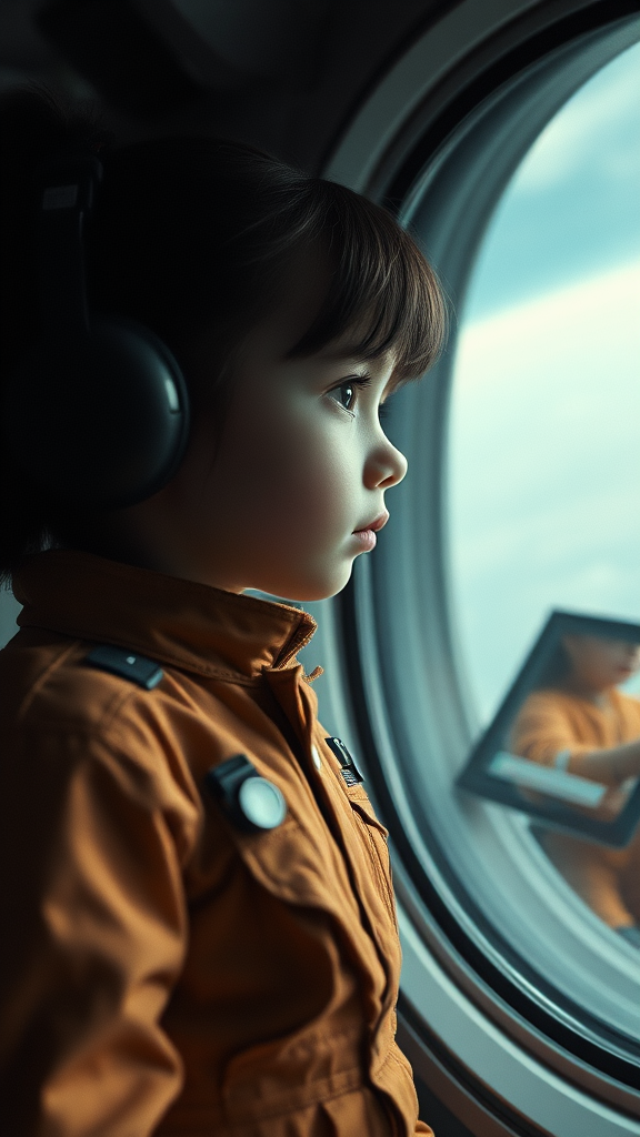 A young girl in a jumpsuit gazes thoughtfully out of a spaceship window, her reflection slightly distorted by the thick glass. The scene is captured in a low-resolution image, showing some blur and pixelation. Odd visual quirks, like minor jpeg artifacts and subtle color shifts, add a unique texture to the frame. The figure appears partially cropped, with hints of elongated proportions, irregular shading, and slight aberrations in anatomy. Soft, muted light filters through the cabin, casting gentle shadows. The interior is a blend of futuristic design and minimalistic style, while subtle imperfections in the rendering create a dreamlike, almost surreal atmosphere.