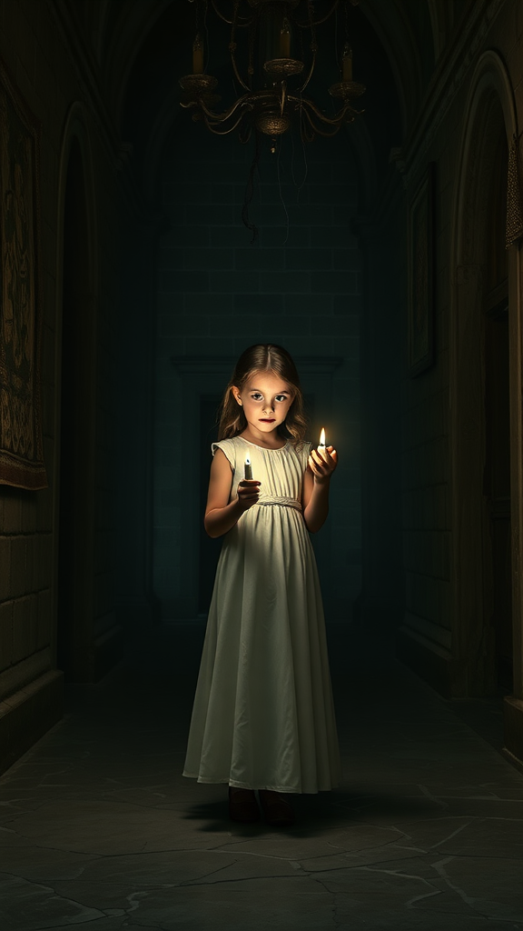 A young girl in a long white dress holding a flickering candle stands cautiously in the shadowy corridors of an ancient, eerie castle. The cold stone walls loom ominously around her, casting dark, shifting shadows that seem to dance in the candlelight. Her expression, though calm, betrays a hint of curiosity and apprehension. The faint scent of old wax and dust fills the air, and her footsteps echo softly on the cracked marble floor. The castle's once-grand architecture is in decay, with cobwebs hanging from ornate chandeliers and faded tapestries lining the walls. She navigates through the dimly lit hallways, her candle creating a small circle of warmth and light in the midst of an overwhelming darkness. There is a mysterious allure to the castle's haunting atmosphere, as though it is alive with whispered secrets and forgotten stories.