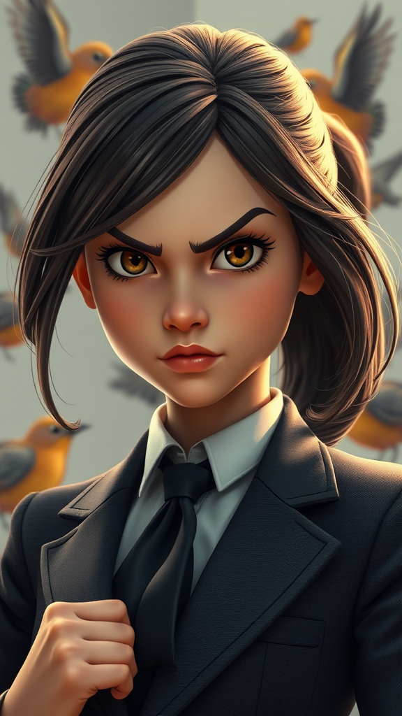A young girl in a sharp business suit with a fiercely determined expression, crafted in the style of Unreal Engine 5, featuring exaggerated, cartoonish elements. The scene is an animated gif that is incredibly captivating, blending life-like bird illustrations seamlessly into the background. The composition captures a close-up view, with soft, romantic undertones that contrast her intense demeanor, evoking a sense of beauty in the juxtaposition.