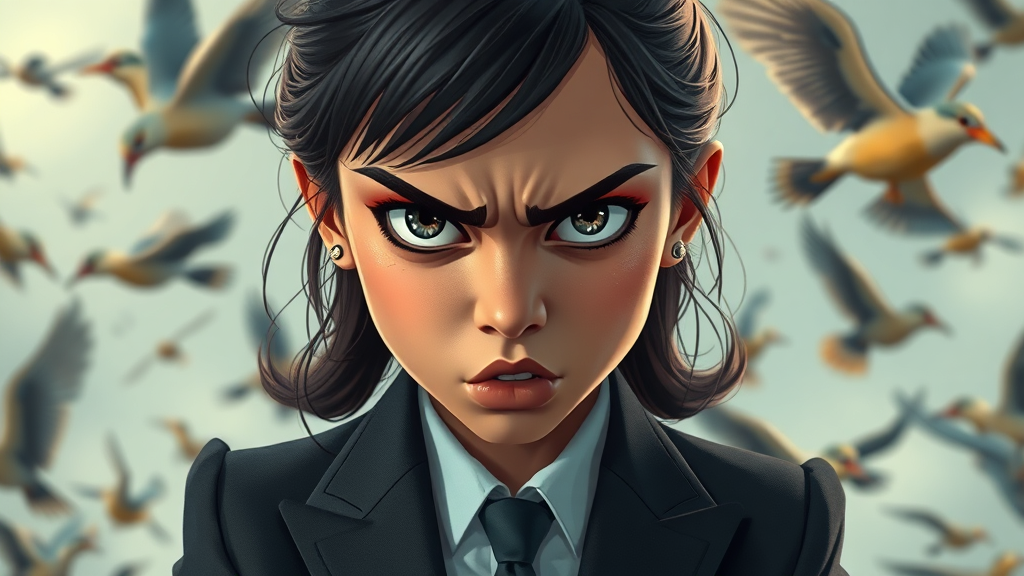 A young girl in a sharply tailored business suit with an intensely angry expression, rendered in the style of Unreal Engine 5 with cartoonish caricature elements, possessing a striking beauty that's almost unbelievable, blended with animated gif aesthetics. As if part of a living scene, set against a backdrop of intricately detailed, life-like avian illustrations, capturing the vivid essence of birds in motion. The close-up reveals a softness around her eyes, contrasting with her fierce expression, set within a dreamy, romantic atmosphere where tensions play out in delicate nuances. The scene is elongated in a panoramic 35:64 ratio with an artistic flair of 750 for enhanced stylization, version 6.