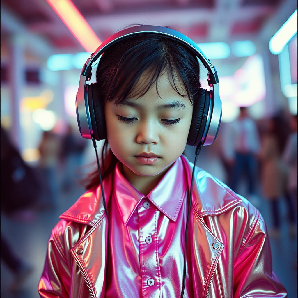 A young girl in a shimmering pink shirt and metallic pink jacket is captivated by music, her headphones blending seamlessly with the liquid metal aesthetic. The scene is composed with elements of deconstructed tailoring and a quirky webcam photography style, featuring bold curves and chinapunk influences. Hints of duckcore style intermingle with the cinematic quality of Ferrania P30 film, creating a striking portrait that challenges conventional design with an imaginative raw edge.