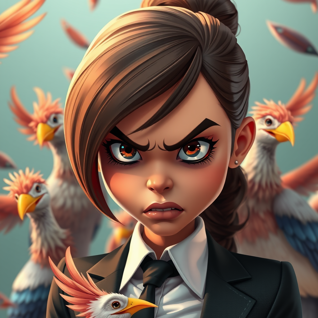 A young girl in a sleek business suit with an intensely angry expression, captured in a vibrant cartoonish caricature style, as if rendered in Unreal Engine 5. The scene is astonishingly beautiful, animated with dynamic movement like an animated gif. Surrounding her are detailed life-like illustrations of avian creatures, their feathers soft and richly colored, adding a touch of romance to the composition. The image is a close-up, focusing on her expressive features, with a hint of a whimsical, surreal environment --ar 35:64 --stylize 750 --v 6.