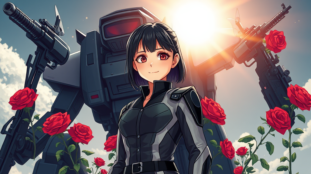 A young girl in a sleek futuristic suit stands confidently, embodying the bold and dynamic style of a classic Soviet-era poster. She is framed by an intricate backdrop of a powerful mech, casting a strong shadow under the bright sun. In the background, an artful arrangement of guns and roses symbolizes strength and beauty. This scene is rendered in vivid anime and manga-inspired graphics, with deep and dark colors typical of offset printing. The image is high in detail, resembling a richly textured poster in 8K resolution. The poster's CMYK palette brings out the vibrant atmosphere, and the girl's cheerful expression is accentuated by the natural lighting that highlights her features in this striking composition.