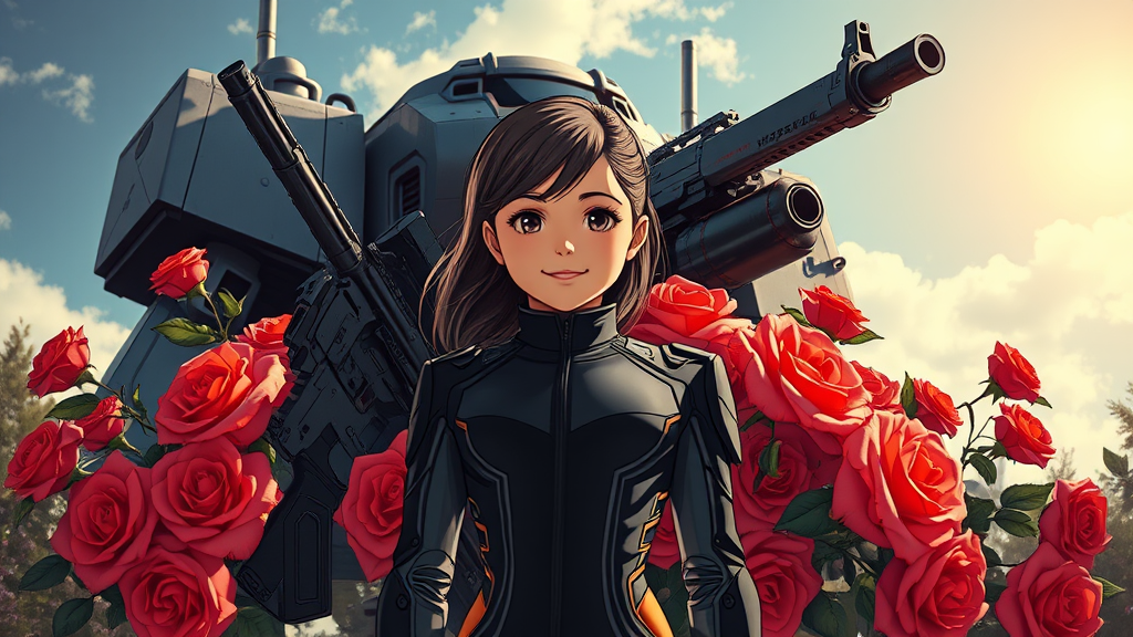 A young girl in a sleek, futuristic suit stands confidently, embodying the style of a classic Soviet poster, with elements reminiscent of USSR art. Behind her are intricately detailed guns intertwined with vibrant roses, creating a striking juxtaposition. A massive mech looms in the background under a clear, sunny sky, while the scene is rendered with anime and manga-inspired graphics. Dark colors dominate the palette, with elements of offset printing lending a vintage feel. The poster is created in high detail, with 8K and HD quality ensuring every nuance is captured. The use of CMYK colors enhances the vibrant yet somber mood, while natural lighting highlights her happy expression, evoking a sense of optimism and resilience.