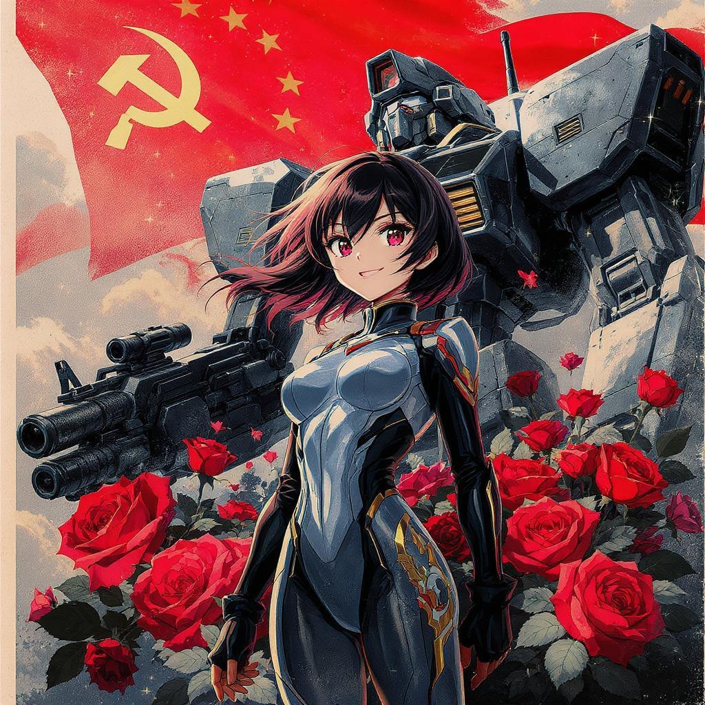 A young girl in a sleek, futuristic suit stands confidently, reminiscent of a Soviet-era poster with a modern twist. The scene is set against a backdrop featuring guns intertwined with vibrant roses and an imposing mech looming majestically. The overall atmosphere is sunny, capturing the brightness of natural lighting, yet the palette is filled with rich, dark colors that give depth and intensity. The style blends anime and manga influences with high-detail, offset printing techniques. The girl's expression is joyful, embodying a sense of optimism and strength. The composition is crafted with 8K, HD quality in mind, utilizing CMYK colors to bring every element to life, maintaining the essence of a vintage poster while embracing a contemporary anime vision.