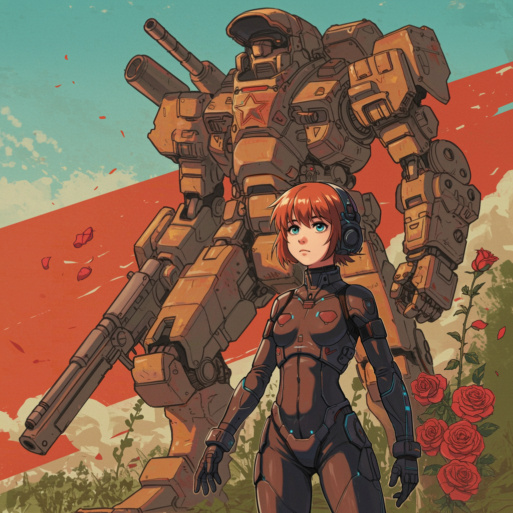 A young girl in a sleek futuristic suit stands confidently against a backdrop reminiscent of a classic Soviet poster, her expression determined and hopeful. The scene is infused with elements of anime and manga graphics, highlighting her vibrant features in high detail. Behind her, a colossal mech looms, its metallic form juxtaposed with delicate roses intertwined around a classic-looking firearm. The bright, sunny weather casts natural lighting across the scene, enhancing the dark, rich colors typical of offset printing. The composition offers a sense of optimism and strength, captured in an 8K HD resolution with a celebratory tone. The detailed CMYK palette enhances the vividness, emphasizing the girl's role as a symbol of resilience and hope.