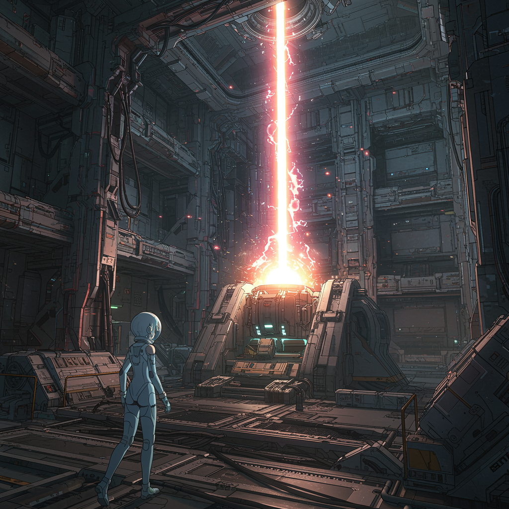 A young girl in a sleek spacesuit navigates the sprawling interior of a futuristic spaceship, exuding the distinctive style of Tsutomu Nihei's work, reminiscent of Sidonia no Kishi. She is dwarfed by the gargantuan structures around her, surrounded by a complex multi-story environment filled with towering technology. In the heart of this sci-fi setting lies a colossal, hyper-detailed laser generator, its core emanating a powerful beam that pierces up towards the sky, illuminating the space with flashes of vibrant energy clots. The scene captures a sense of acceleration and mesmerizing speed, enhanced by bursts of light that blaze across the high-definition 8K scene, akin to a frame from an intricately detailed anime drawing. The manga-inspired graphics seamlessly blend a first-person perspective with the surreal, surrealism-infused architecture, creating a super-resolution visual masterpiece that invites viewers to explore its depth and grandeur.