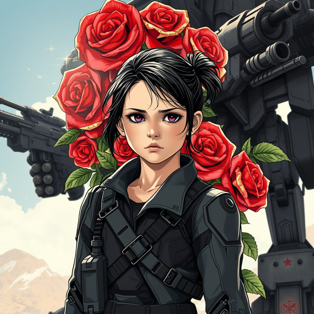 A young girl in a slightly tattered futuristic suit, her expression resilient and hopeful, styled like a classic Soviet poster. The background features a striking combination of guns intertwined with vibrant roses, set against the imposing figure of a mech. The day is bright and sunny, casting defined shadows that enhance the artwork's rich details. The art is influenced by anime and manga graphics, utilizing a palette of dark colors and the texture of offset printing to achieve a high level of detail. This poster-like piece, rendered in 8k, showcases intricate and ornate illustrations reminiscent of Johanna Rupprecht and William Morris, capturing a sense of tradition meeting futuristic vision. The design is trending on art platforms, presenting a captivating blend of resilience and beauty.