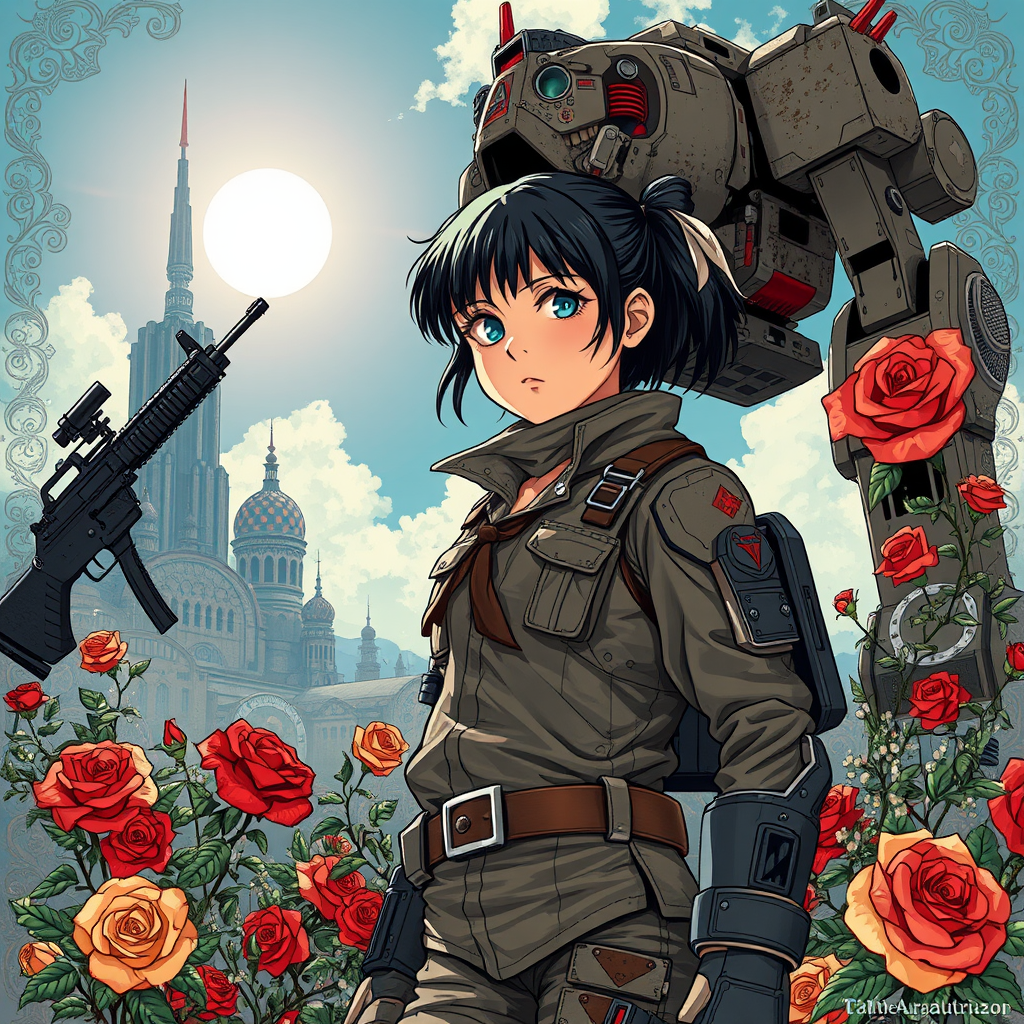 A young girl in a tattered, futuristic suit stands determinedly, evoking the bold style of a Soviet-era poster. Behind her, a contrasting tableau of guns and roses weaves into the intricate backdrop, while a towering mech looms under the clear, sunlit sky. The scene is depicted with the dynamic flair of anime and manga graphics, using dark, rich colors reminiscent of offset printing. The artwork bursts with high detail and ornate patterns, combining the intricate illustration techniques of Johanna Rupprecht with the decorative elegance of William Morris. This vividly rendered poster, in 8k resolution, captures a sense of bravery and resilience, trending on artstation.