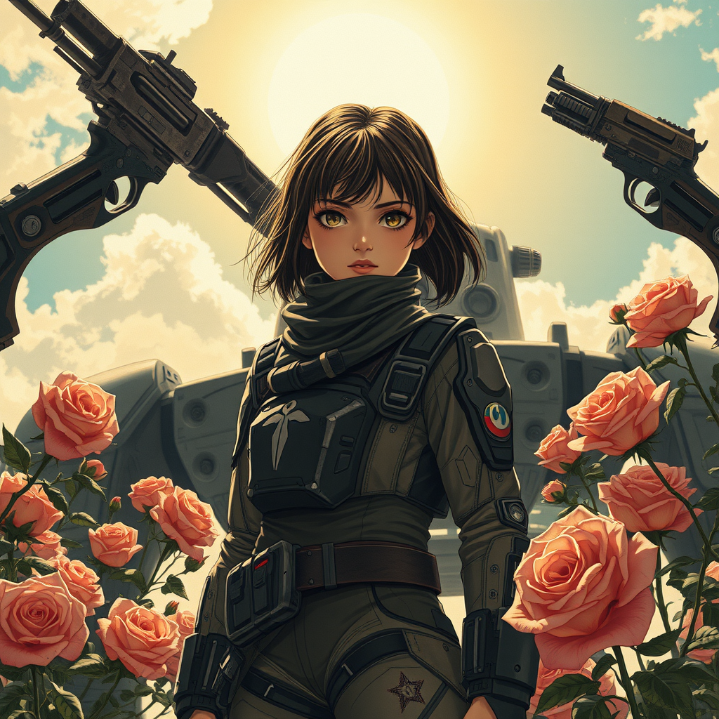 A young girl in a tattered futuristic suit stands confidently, reminiscent of a Soviet poster style, with influences from USSR propaganda art. Her intense gaze is framed by anime and manga graphics, and she stands against a backdrop of a formidable mech under a bright, sunny sky. Surrounding her, a juxtaposition of guns and blooming roses create a stark contrast. Though the color palette is dark, the scene is rendered in high detail using offset printing techniques, reminiscent of Johanna Rupprecht's and William Morris's intricate and ornate craftsmanship. The composition is a detailed illustration with octane render quality, capturing the essence of a trending piece on ArtStation, delivering an 8k resolution masterpiece.