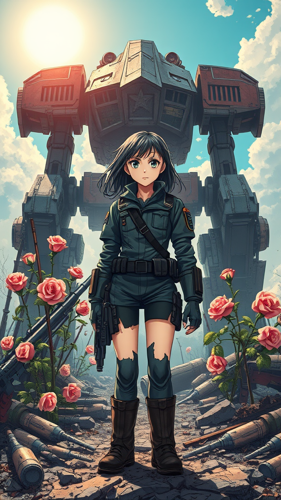A young girl in a torn, futuristic uniform stands defiantly, her expression one of determination amidst the remnants of a once-mighty landscape. The style echoes the powerful visuals of classic Soviet and USSR propaganda posters. Behind her, a juxtaposition of gun barrels and blooming roses paints a scene of conflict and hope. Looming in the background, a colossal mech adds an imposing presence beneath a sunlit, azure sky. The atmosphere is rendered in anime and manga graphics, with a dark yet vibrant color palette. The poster, with its offset printing style, is rich in high detail and intricate patterns. It draws upon the ornate illustrations typical of Johanna Rupprecht and William Morris, creating a visual narrative that feels both timeless and strikingly modern. The image is trending on ArtStation as an 8k masterpiece, capturing intricate, ornate details in a detailed illustration reminiscent of an octane render.